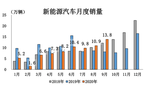 9月,新能源汽車產(chǎn)銷分別完成13.6萬輛和13.8萬輛,同比分別增長48.0%和67.7%。得益于政府對新能源汽車消費的支持,及企業(yè)的有力舉措,新能源汽車市場規(guī)模穩(wěn)中有升,本月新能源汽車產(chǎn)銷刷新了9月歷史記錄。