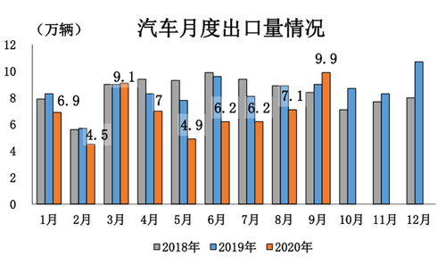 9月,汽車企業(yè)出口9.9萬輛,環(huán)比增長39.1%,同比增長10.7%。分車型看,乘用車本月出口7.5萬輛,環(huán)比增長40.6%,同比增長14.7%;商用車出口2.4萬輛,環(huán)比增長34.7%,同比下降0.3%。