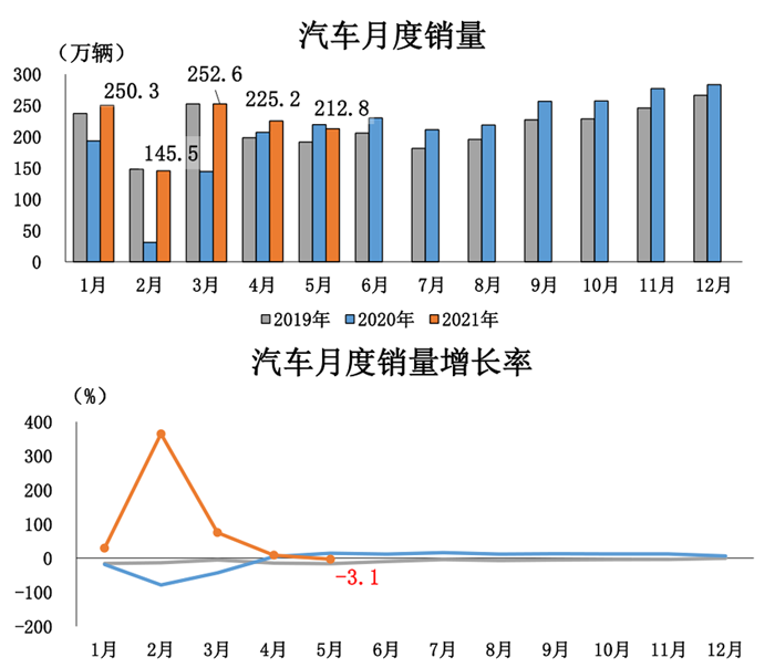 1-5月,汽車產銷分別完成1062.6萬輛和1087.5萬輛,同比分別增長36.4%和36.6%,增幅比1-4月繼續回落17和15.2個百分點。與2019年同期相比,產銷同比分別增長3.6%和5.8%,增幅比1-4月擴大1.5和1.3個百分點。