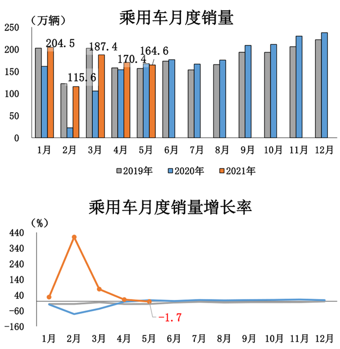1-5月,乘用車產銷分別完成828.5萬輛和843.7萬輛,同比分別增長39.1%和38.1%,增幅比1-4月繼續回落16.2和15個百分點。與2019年同期相比,產量同比分別下降1.4%,銷量同比增長0.3%,其中產量降幅比1-4月繼續收窄2個百分點,銷量增速已實現由負轉正。