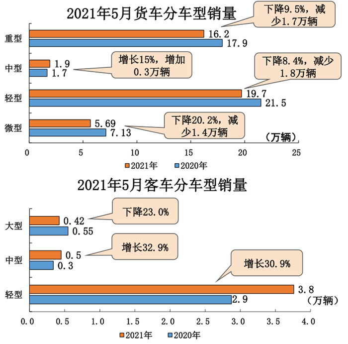 1-5月,商用車產銷分別完成234.1萬輛和243.8萬輛,同比分別增長27.8%和31.9%,增幅比1-4月別回落19.2和15.4個百分點。與2019年同期相比,商用車產銷同比增長26%和30.6%,其中產量增幅比1-4月回落1.8個百分點,銷量增幅比1-4月擴大1.5個百分點。
