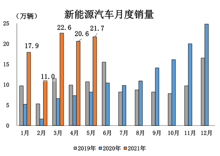 5月,新能源汽車產銷均完成21.7萬輛,同比分別增長1.5倍和1.6倍,繼續刷新當月歷史記錄。其中純電動汽車產銷分別完成18.1萬輛和17.9萬輛,同比分別增長1.8倍和1.7倍;插電式混合動力汽車產銷分別完成3.6萬輛和3.9萬輛,同比分別增長67.8%和1.2倍;燃料電池汽車產銷分別完成38輛和9輛,同比分別下降41.5%和90.0%。