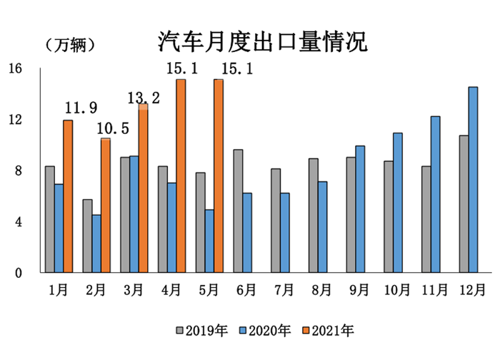 1-5月,汽車企業出口67.0萬輛,同比增長1.1倍。分車型看,乘用車出口51.1萬輛,同比增長1.1倍;商用車出口15.8萬輛,同比增長1倍。