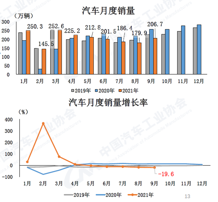9月,汽車產銷分別達到207.7萬輛和206.7萬輛,環比增長20.4%和14.9%,同比下降17.9%和19.6%。