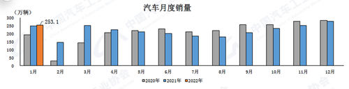 1月,汽車產(chǎn)銷分別達(dá)到242.2萬輛和253.1萬輛,環(huán)比下降16.7%和9.2%,同比增長1.4%和0.9%。