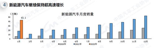 1月,新能源汽車產(chǎn)銷環(huán)比有所下降,同比繼續(xù)保持高速增長。產(chǎn)銷分別達(dá)到45.2萬輛和43.1萬輛,環(huán)比下降12.6%和18.6%,同比增長1.3倍和1.4倍。在新能源汽車主要品種中,與上月相比,純電動(dòng)汽車產(chǎn)銷有所下降,插電式混合動(dòng)力汽車呈小幅增長;與上年同期相比,純電動(dòng)汽車和插電式混合動(dòng)力汽車產(chǎn)銷依然延續(xù)高速增長勢(shì)頭。