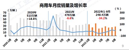 1-9月,商用車產(chǎn)銷分別完成242.6萬輛和248.4萬輛,同比下降32.6%和34.2%,降幅較1-8月收窄1.5和2個百分點。在商用車主要品種中,與上年同期相比,客車和貨車產(chǎn)銷均呈較快下降。商用車市場表現(xiàn)依然相對低迷,商用車作為生產(chǎn)資料的屬性,與宏觀經(jīng)濟、基建投資、房地產(chǎn)投資等因素高度相關,市場的恢復難度更大。