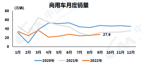 9月,商用車產(chǎn)銷分別完成26.3萬輛和27.9萬輛,環(huán)比增長10.5%和7.9%,同比下降15.6%和12.5%。在商用車主要品種中,與上月相比,貨車和客車產(chǎn)銷均實現(xiàn)不同程度增長;與上年同期相比,客車產(chǎn)量略降、銷量微增,貨車產(chǎn)銷均下降。