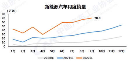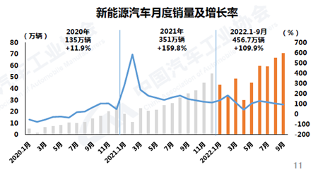 9月,新能源汽車繼續(xù)保持高速增長,月度產(chǎn)銷再創(chuàng)歷史新高,分別達到75.5萬輛和70.8萬輛,環(huán)比增長9.3%和6.2%,同比增長1.1倍和93.9%,市場占有率達到27.1%。