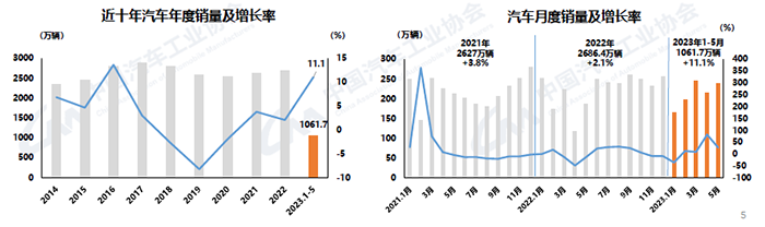 1-5月,汽車產銷同比均增長11.1%。由于去年4-5月同期基數相對較低,累計產銷增速較1-4月進一步擴大。