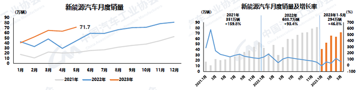 5月,新能源汽車繼續延續快速增長態勢,市場占有率進一步提升。當月產銷分別達到71.3萬輛和71.7萬輛,環比分別增長11.4%和12.6%,同比分別增長53%和60.2%,市場占有率達到30.1%。