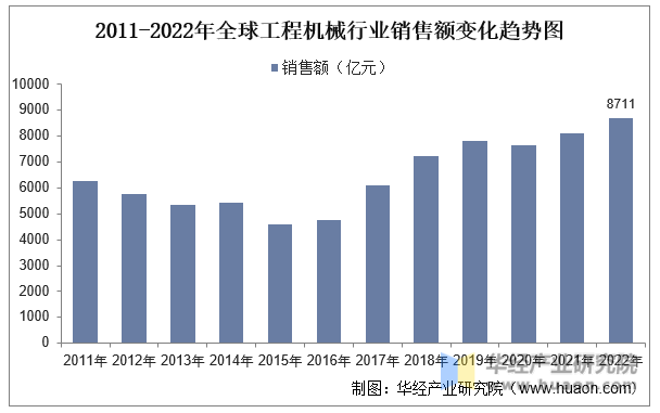 華經產業研究院有針對工程機械行業的分析報告顯示,2021年全球工程機械總銷售額突破8000億元。2022年銷售額維持高增速,達到8710.9億元,同比增長7.7%。2022年全球工程機械銷售金額達新高,2011-2022年期間復合年增長率為3.05%。分區域來看,北美為全球第一大市場且保持高增,歐洲、新興市場國家需求同樣較為旺盛。