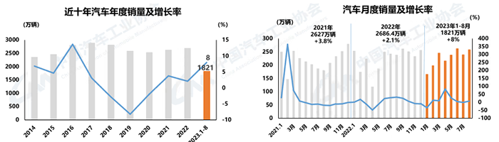 8月,汽車產銷分別達到257.5萬輛和258.2萬輛,環比分別增長7.2%和8.2%,同比分別增長7.5%和8.4%。1-8月,汽車產銷累計完成1822.5萬輛和1821萬輛,同比分別增長7.4%和8%。