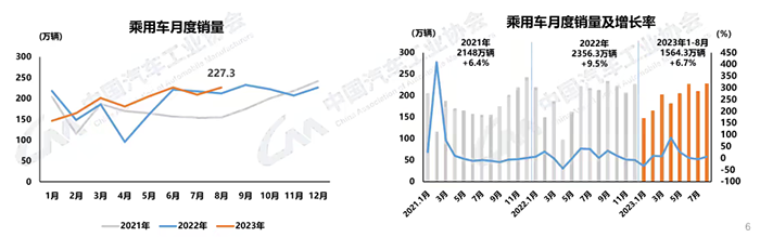 1-8月,乘用車產銷累計完成1567.2萬輛和1564.3萬輛,同比分別增長5.9%和6.7%。在乘用車主要品種中,與上年同期相比,運動型多用途乘用車(SUV)和多功能乘用車(MPV)產銷明顯增長,基本型乘用車(轎車)產銷微降,交叉型乘用車產銷呈兩位數下降。