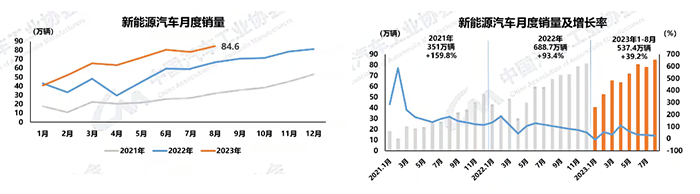 1-8月,新能源汽車產銷累計完成543.4萬輛和537.4萬輛,同比分別增長36.9%和39.2%,市場占有率達到29.5%。在新能源汽車主要品種中,與上年同期相比,三大類汽車產銷均呈較快增長。