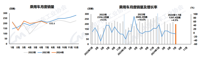 1-7月,乘用車產銷累計完成1391.7萬輛和1397.4萬輛,同比分別增長3.9%和4.5%。