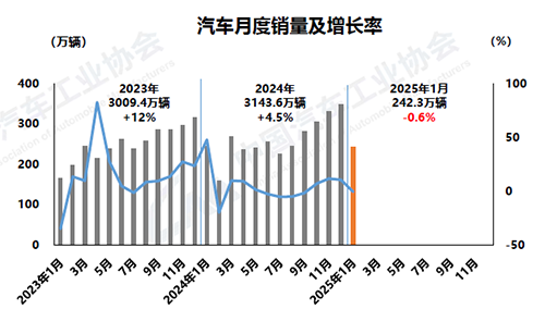 中國汽車工業協會最新數據顯示,2025年1月,汽車產量實現小幅增長,銷量較同期只微降,行業迎來平穩開局。其中,乘用車延續良好表現,產銷同比雙增;商用車市場需求偏低,銷量同比有所下降;新能源汽車表現亮眼。當月,汽車產銷分別完成245萬輛和242.3萬輛,環比分別下降27.2%和30.5%,產量同比增長1.7%、銷量同比下降0.6%。