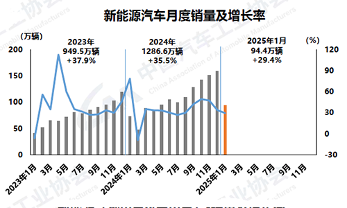 1月,新能源汽車同比繼續保持較快增長。當月,新能源汽車產銷分別完成101.5萬輛和94.4萬輛,環比分別下降33.7%和40.9%,同比分別增長29%和29.4%,新能源汽車新車銷量達到汽車新車總銷量的38.9%。