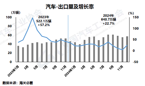 進出口方面,據中國汽車工業協會整理的海關總署數據,2024年12月,汽車進口6.8萬輛,環比增長12.4%,同比下降15.4%;出口57.4萬輛,環比增長4.6%,同比增長24.9%。