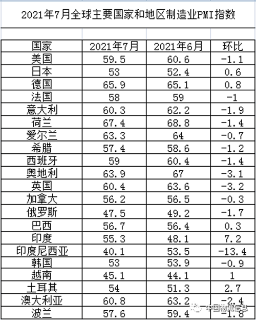 2021年7月份,歐洲制造業PMI較上月下降0.7個百分點至60.7%,連續2個月小幅回落。從主要國家看,德國制造業PMI較上月小幅上升;英國、法國、意大利等國制造業PMI較上月均有不同程度回落。