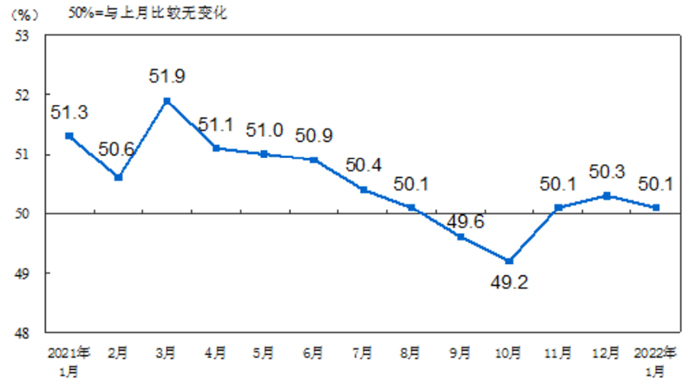 數據顯示,1月份,中國制造業采購經理指數(PMI)為50.1%,比上月回落0.2個百分點,高于臨界點,制造業擴張步伐有所放慢。從企業規模看,大型企業PMI為51.6%,比上月上升0.3個百分點,高于臨界點;中型企業PMI為50.5%,比上月下降0.8個百分點,高于臨界點;小型企業PMI為46.0%,比上月下降0.5個百分點,低于臨界點。