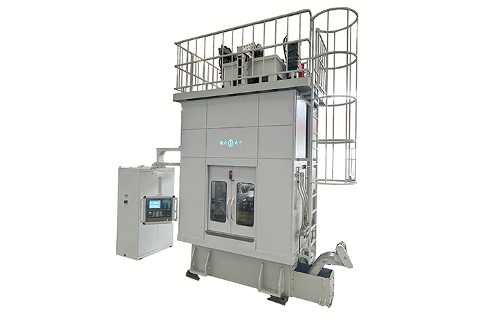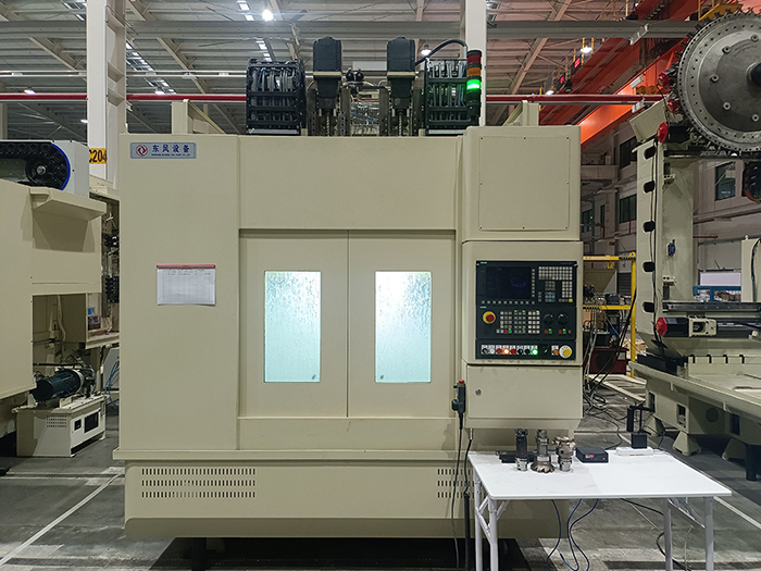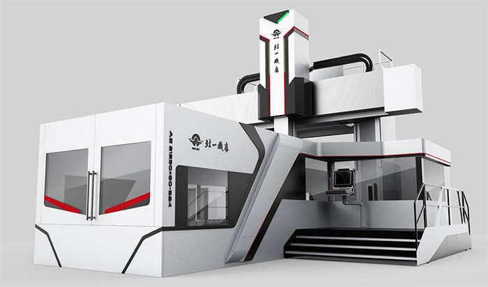 該機是新能源壓鑄車身零件加工專機,配置偏置式雙擺角萬能銑頭、自動翻轉(zhuǎn)液壓夾具、鼓式直排刀庫,一次裝夾,可實現(xiàn)壓鑄車身結(jié)構(gòu)件正反五面所有加工特征的高速、高精、高效自動加工。4CNC設(shè)備組線配置,與后續(xù)安裝拉鉚、壓鉚螺母、鋼絲螺套工位以及檢測工位等組成一體化車身鋁壓鑄零件加工機裝配生產(chǎn)線,滿足汽車主機廠產(chǎn)能和節(jié)拍需求。機床采用高剛度整體框架結(jié)構(gòu),移動部件采用超輕設(shè)計、各軸均采用電機直驅(qū)形式,配置鋁合金材質(zhì)偏置式BC擺頭,提高機床動態(tài)性能,直線軸快進速度達到120m/min,加速度達到7m/s。研發(fā)自動翻轉(zhuǎn)工作臺,一次裝夾完成所有要素加工。同時根據(jù)零件數(shù)模,開展銑削特性研究與機床運動仿真,優(yōu)化加工工藝路徑,形成總體工藝方案。該產(chǎn)品主要應用在新能源汽車大型壓鑄車身零件的高速高效加工。
