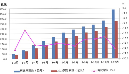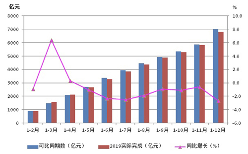 圖2為2019年1-12月份營業收入同比變化與2018年主營業務收入同比變化的對比。由圖可見,2018年4月份達到14.6%的高點之后波動下行,但全年仍保持了8.3%的同比增長,而2019年除1-3月、1-4月為累計同比增長之外,其余各月均為同比降低,行業下行壓力明顯大于2018年。