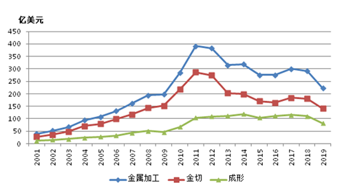 2019年我國金屬加工機床消費額223.1億美元,同比降低23.5%,其中金屬切削機床消費額141.6億美元,同比降低21.8%;金屬成形機床消費額81.5億美元,同比降低26.2%。2001-2019年國內金屬加工機床消費額變動趨勢見圖8。