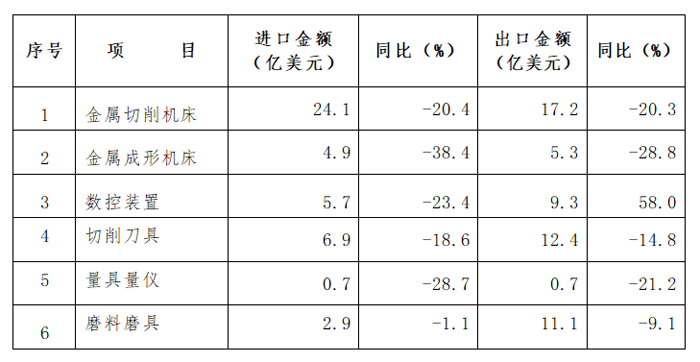 金屬加工機床進口額29.0億美元,同比下降24.1%,降幅較一季度(-32.3%)收窄7.1個百分點。其中,金屬切削機床進口額24.1億美元,同比下降20.4%,降幅較一季度(-27.4%)收窄7個百分點;金屬成形機床進口額4.9億美元,同比下降38.4%,降幅較一季度(-48.5%)收窄10.1個百分點。