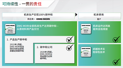 DMGMORI中國總裁兼總經(jīng)理高健介紹說,DMG MORI2015年開始進行碳中和相關(guān)工作,經(jīng)過了近6年時間努力,在2020年所有機床生產(chǎn)實現(xiàn)碳中和。從2021年起,其生產(chǎn)的全部機床達到碳中和,包括從原材料采購到產(chǎn)品交付的全過程,即交付出綠色機床。在這幾年中,他們切實采取了綜合性措施, 具體體現(xiàn)在綠色機床、綠色模式、綠色技術(shù)三個方面 (請關(guān)注后續(xù)報道)