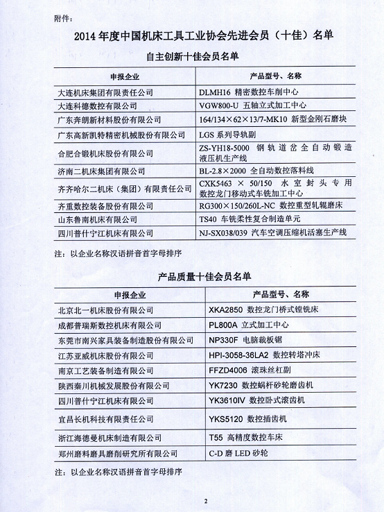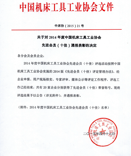 關于對2014年度中國機床工具工業協會先進會員(十佳)通報表彰的決定