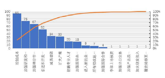 從上述數據看,制約企業發展的主要問題中與市場相關的占到41.9%,與經營和成本相關的占到20.1%,與人力資源相關的占到18.9%。為了應對以上問題,企業也采取了相應的措施,從這些措施的分布情況看,與之前分析得到的市場和行業運行的一些趨勢性特征比較吻合。
