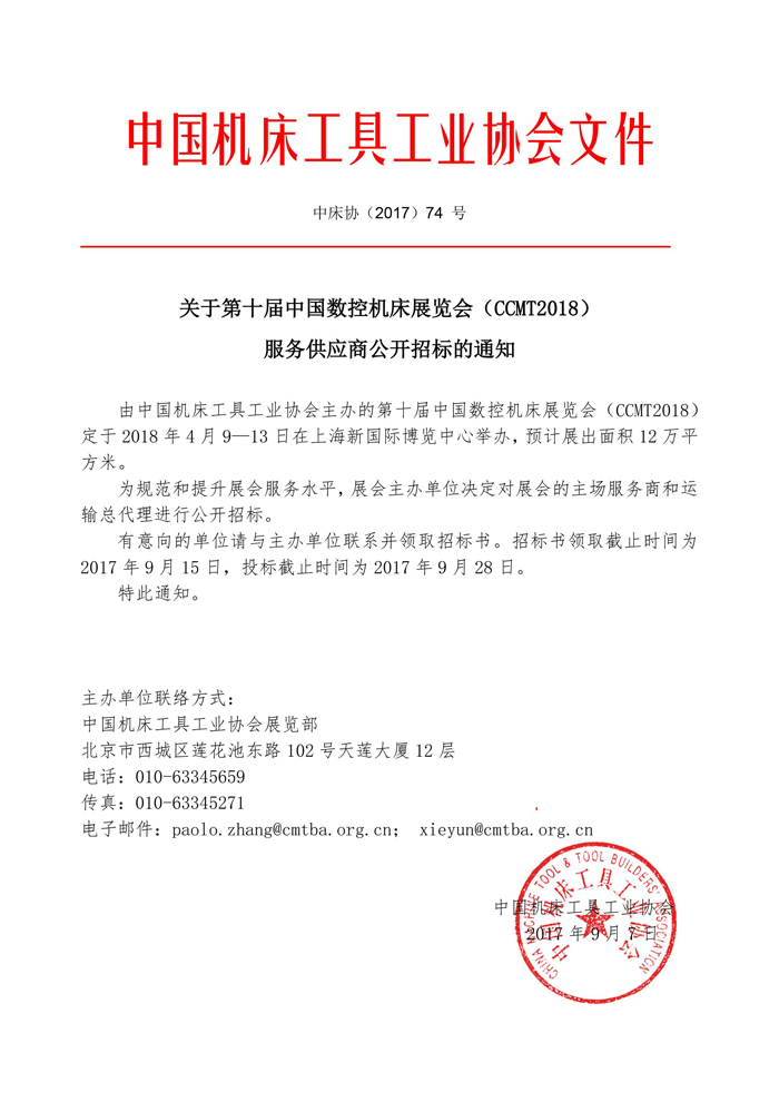 關(guān)于第十屆中國(guó)數(shù)控機(jī)床展覽會(huì)(CCMT2018) 服務(wù)供應(yīng)商公開(kāi)招標(biāo)的通知