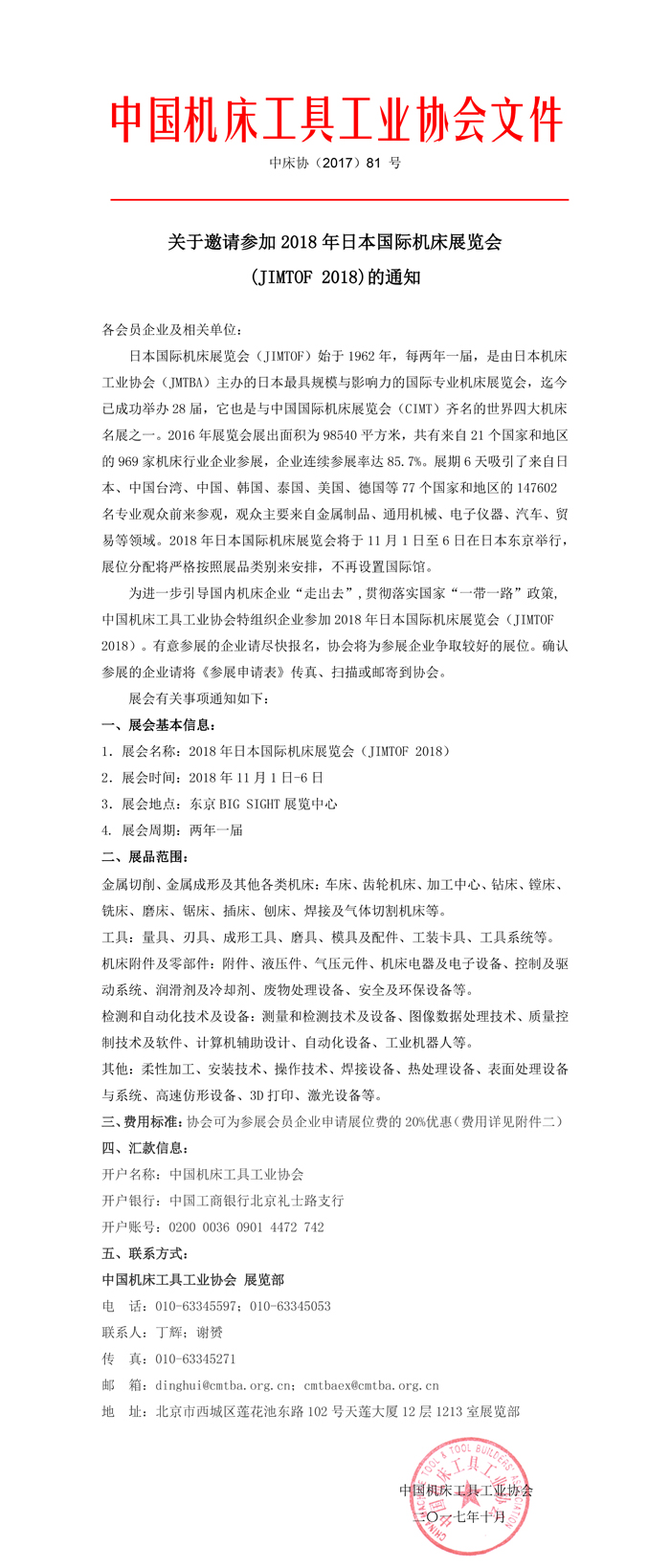關于邀請參加2018年日本國際機床展覽會 (JIMTOF 2018)的通知