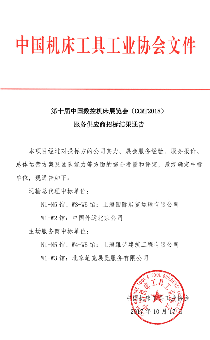第十屆中國數控機床展覽會(CCMT2018)服務供應商招標結果通告