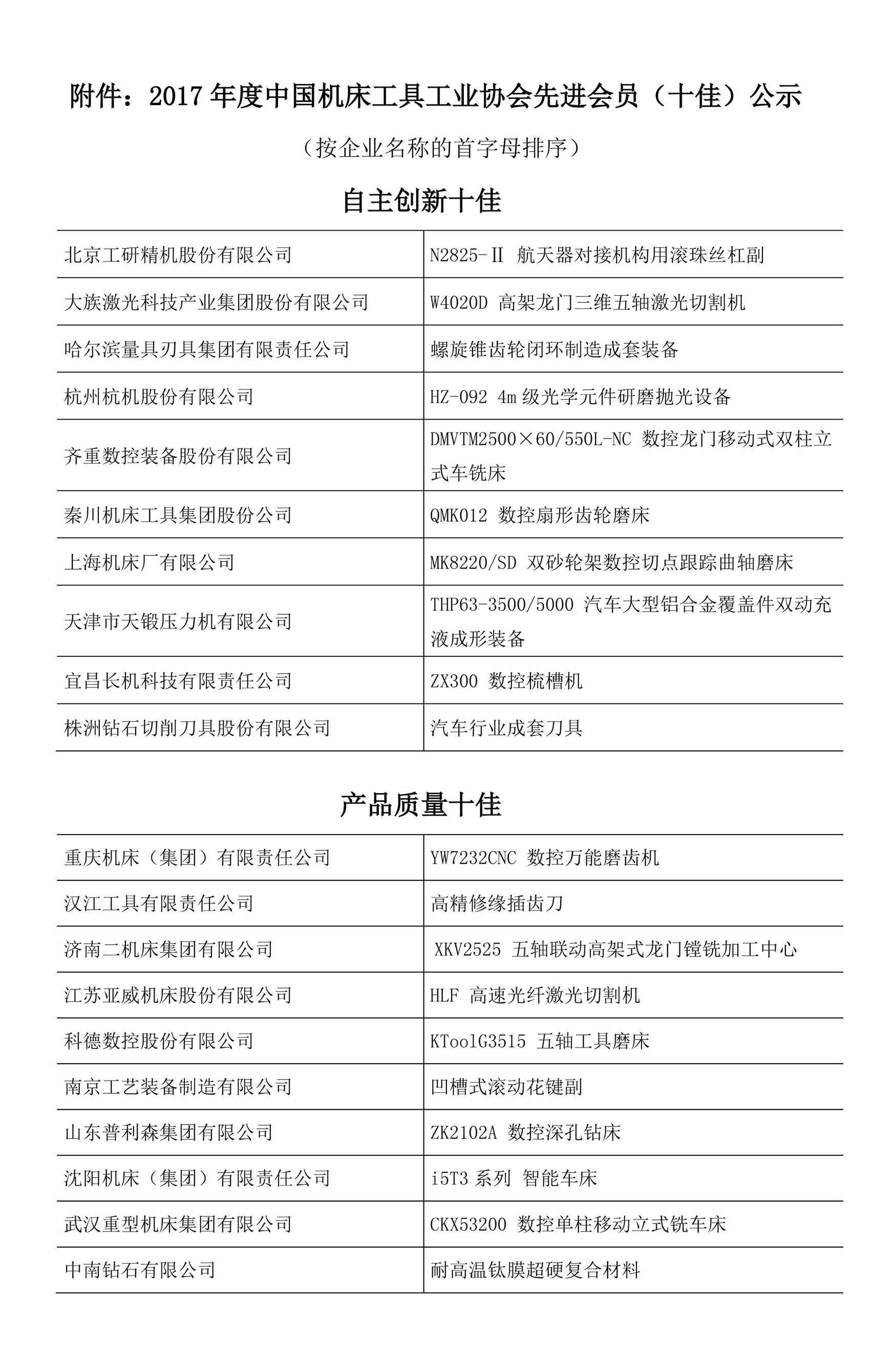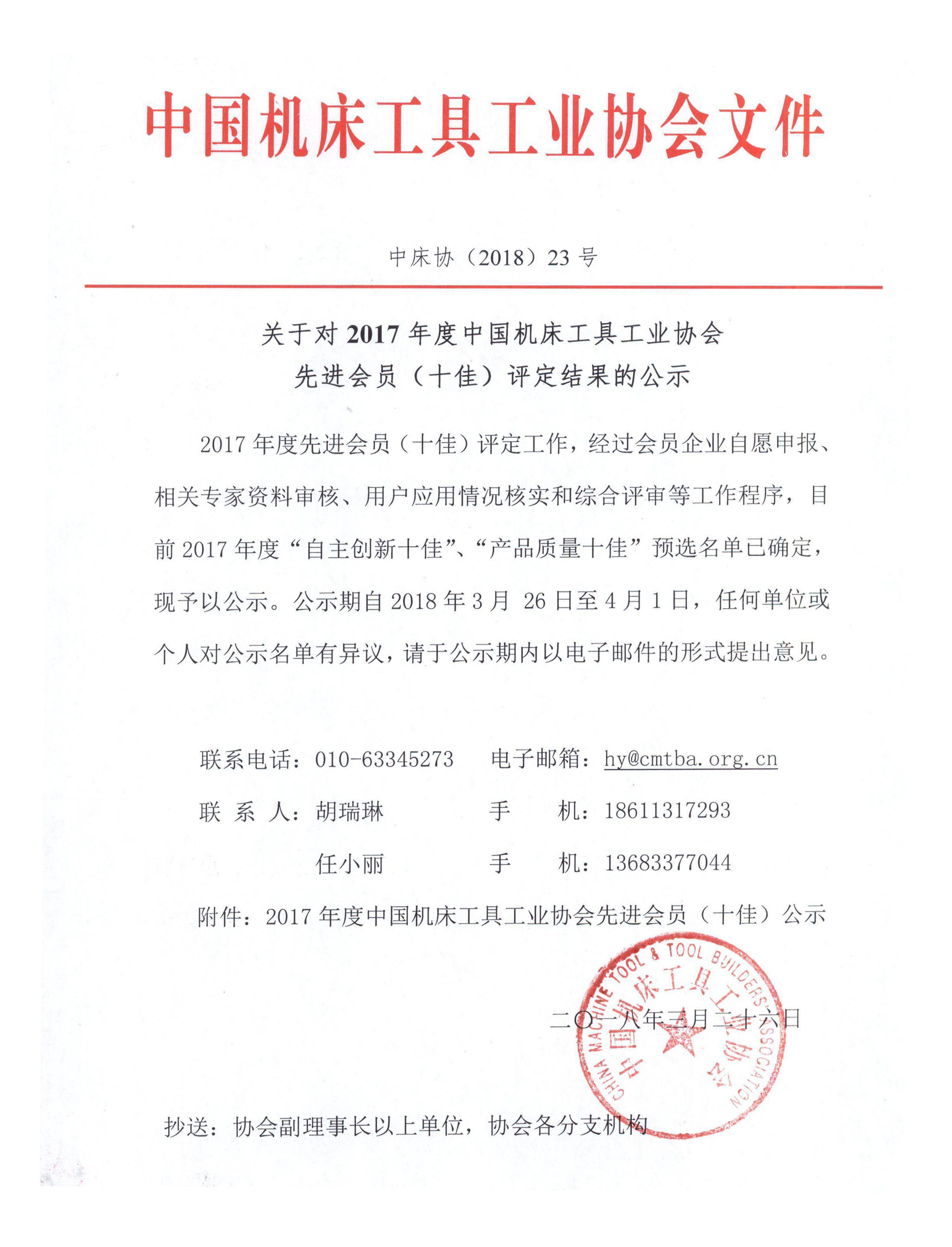 關于對2017年度中國機床工具工業協會先進會員(十佳)評定結果的公示