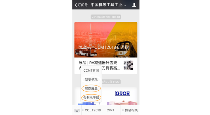 進入微信訂閱號,點開底部菜單,發(fā)現(xiàn)“展商展品”和“會刊電子版”,任意瀏覽~~
