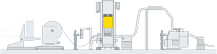 與傳統壓力機的壓力點位于滑塊上方不同,MSP 400 的壓力點在工作臺區域以外。這樣,設備可以吸收非常高的偏心載荷,即在進料側與出料側可以增加約 25% 的壓力。因此,在第一模具階段就可對高強度材料進行加工。
