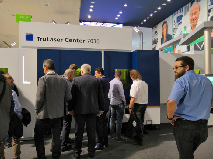 通快公司展出了10多臺金屬成形加工設備,主要有激光切割、激光焊接、折彎、轉塔沖等,還展出了一臺3D打印設備,一臺激光打標設備。其中Trulaser 5030、Trulaser Cell 7040激光切割機,Trubend 7036、Trubend 7050折彎機屬于全球首展。