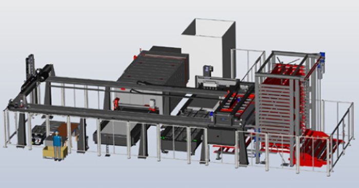 全自動激光切割中心,由10kW的ByStar Fiber 3015的激光切割機、ByTrans Cross3015模塊化自動上下料系統、BySort4.0自動分揀系統、Antil塔式存儲系統組成。