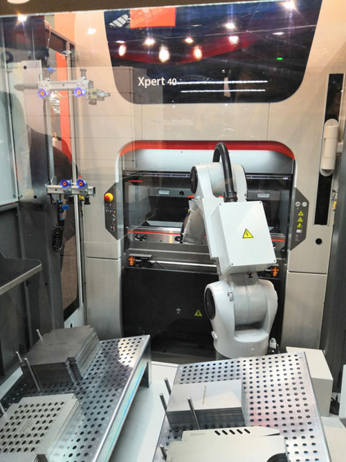 全自動折彎中心由一臺Xpert Pro 150折彎機和一臺7軸機器人組成。機器人最大承重270kg;Xpert Pro 150折彎機壓力1500kN。