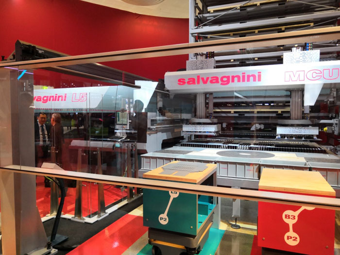 薩瓦尼尼的展品有激光切割+沖復合加工機床S1,折彎機B3AU-TO、激光切割機床L5、折彎中心P2Lean,柔性生產線S4+P4。其中,激光切割+沖復合加工機床S1是薩瓦尼尼最新推出的產品,本次展出屬于該產品的全球首展。折彎機B3AU-To的創新主要在于其換模機構。激光切割機L5的創新體現在軟件上,它采用了新的軌跡規劃軟件,能夠最大限度地提高機床的性能,最小的消耗,更短的維護時間,他還可以和新的物料庫LTWS相連接。折彎中心P2lean則在各個展覽會上多次展出過。