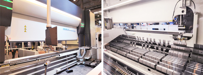 (1)折彎機配置自動換模機構。通快、薩瓦尼尼、天田都展出了各自配置自動換模機構的折彎機。如通快的Trubend 5130 +ToolMaster,薩瓦尼尼的B3 AU-TO,天田的HG2204+ATC折彎機。