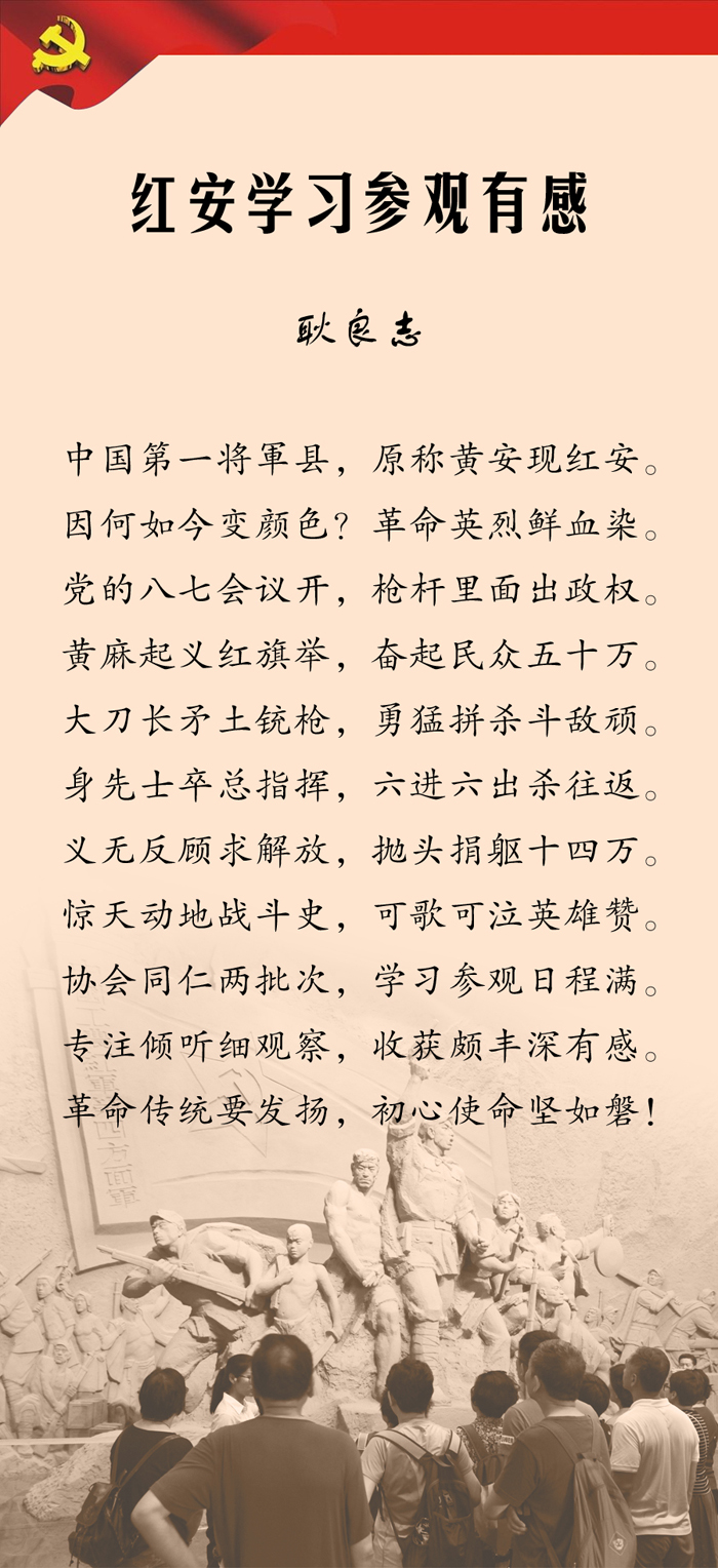紅安學習參觀后,協會黨支部副書記耿良志和市場部主任屠景先有感而發,創作了詩歌作品,在此一并發布,供大家賞析。