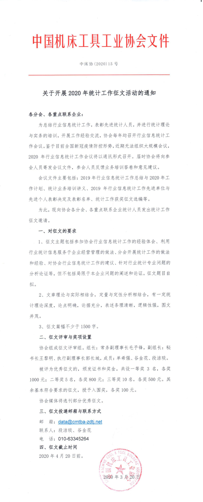 為加強協(xié)會信息統(tǒng)計工作,加大統(tǒng)計人員之間的工作經(jīng)驗分享和交流,在目前因疫情防控需要無法召開相關會議的情況下,中國機床工具工業(yè)協(xié)會向各分會和重點聯(lián)系企業(yè)統(tǒng)計人員發(fā)出統(tǒng)計工作征文邀請,協(xié)會將對征文進行評獎,向獲獎作者頒發(fā)證書和獎金。部分優(yōu)秀征文作品將在協(xié)會官方媒體發(fā)布。