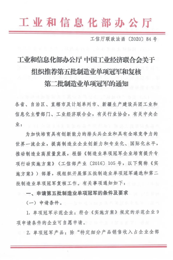 通知|工信部和工經聯組織推薦第五批制造業單項冠軍