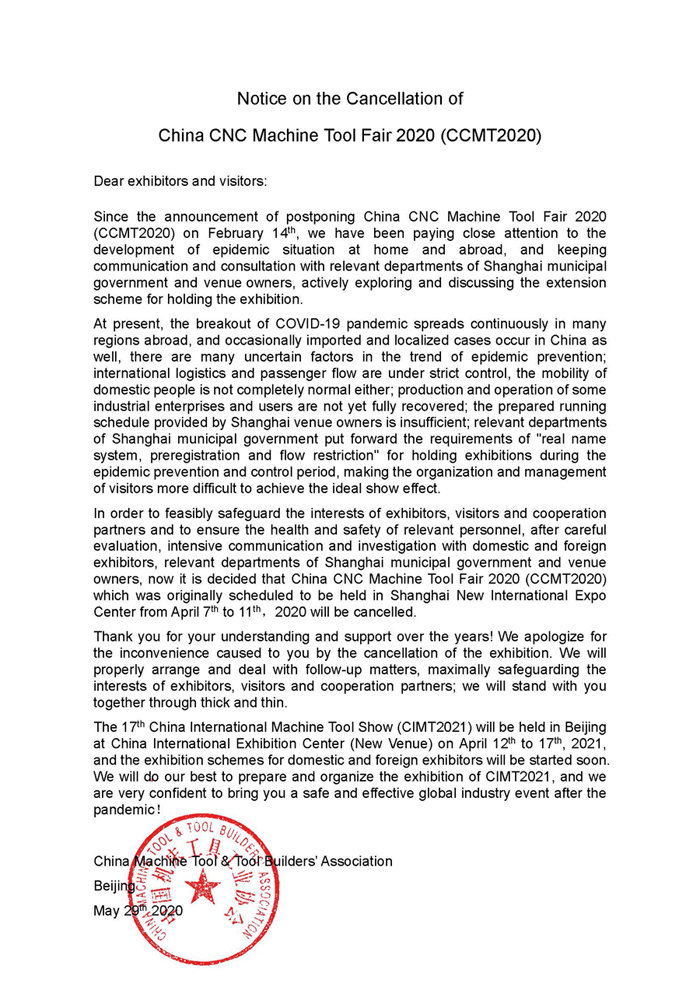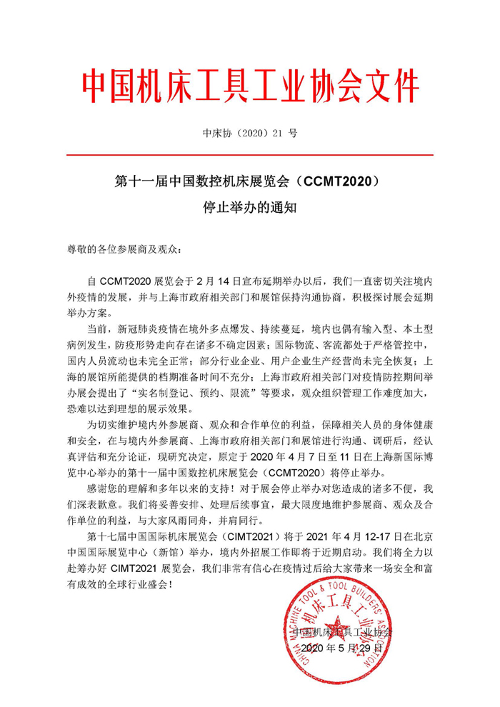 第十一屆中國數控機床展覽會(CCMT2020)停止舉辦的通知