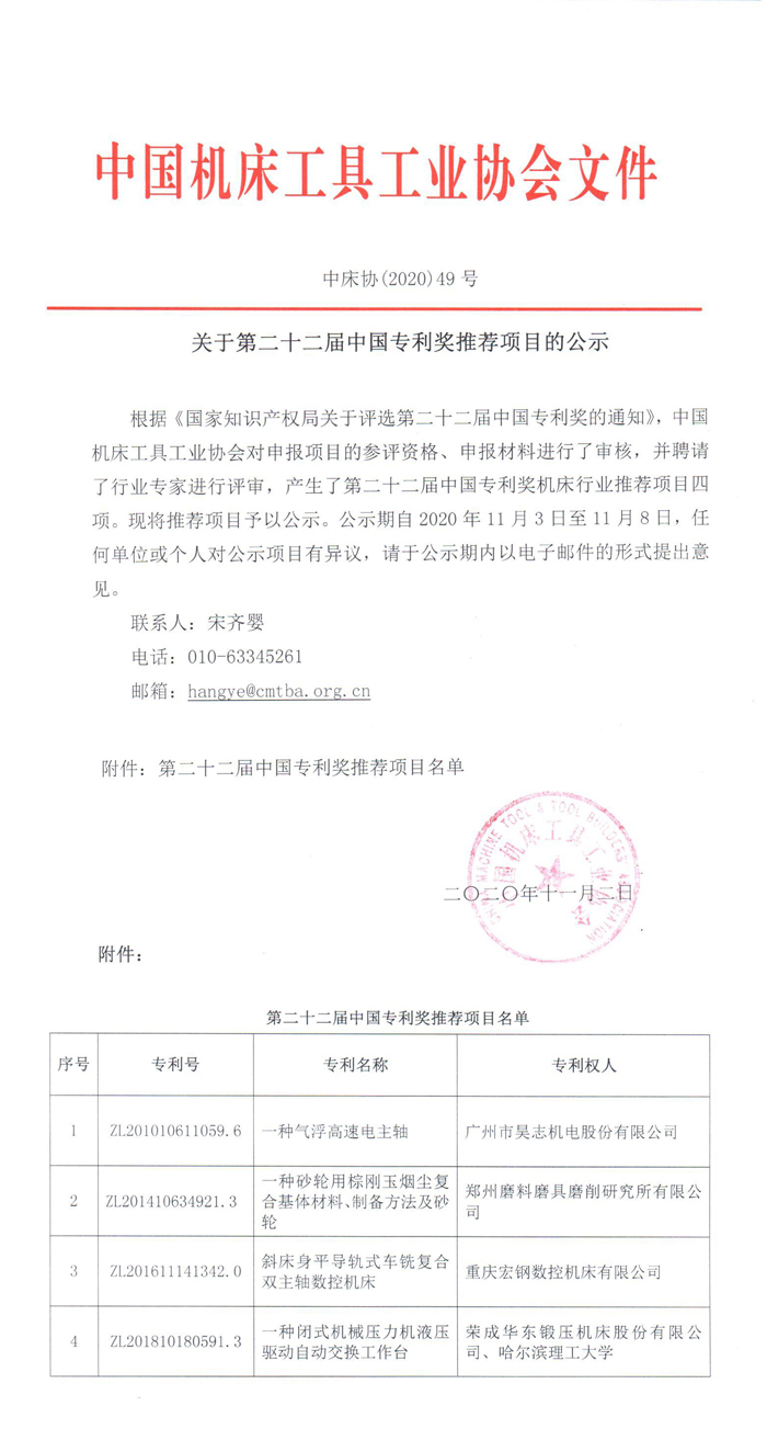 關(guān)于第二十二屆中國(guó)專利獎(jiǎng)推薦項(xiàng)目的公示