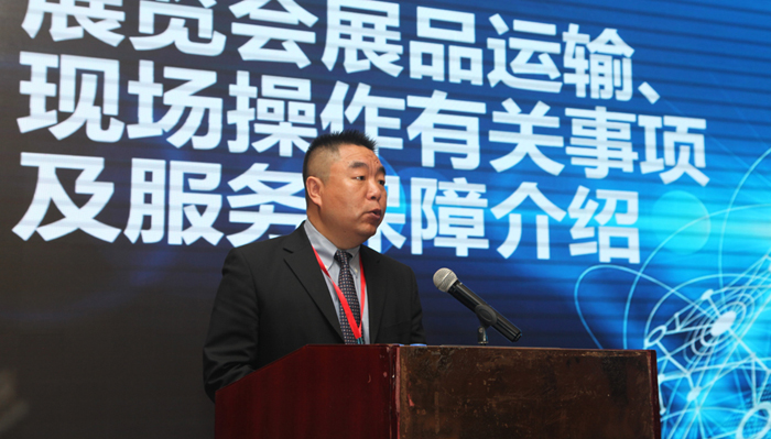 CIMT2021展會運輸總代理代表——中國外運北京有限公司陳強總經理,向展商代表們介紹了展覽會展品運輸、現場操作有關事項及服務保障工作。北京外運會展服務有限公司史志剛總經理,從服務承諾、服務計劃、服務創新和服務保障等四個方面,介紹了具體服務工作和相關業務組織情況。展會主場服務商代表——北京筆克展覽展示有限公司鈕鶴鳴副總經理,就展覽會特裝搭建、水電氣供應、展具租賃等注意事項及服務保障工作向代表們做了介紹。