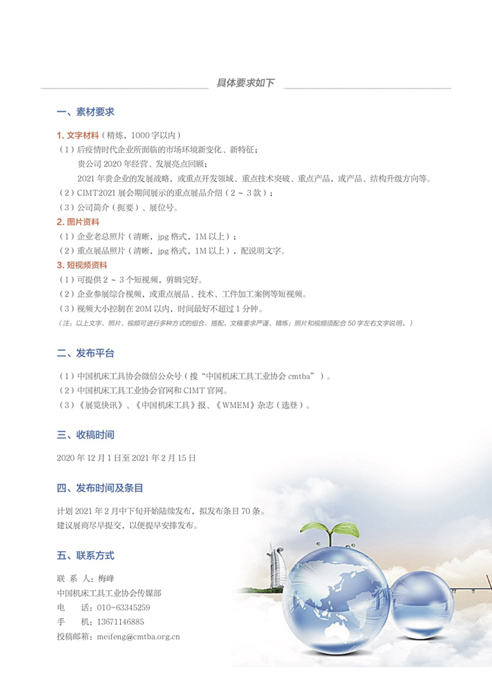 CIMT2021“展商風采”將圍繞展會主題“融合共贏 智造未來”,涵蓋數(shù)字技術(shù)、工業(yè)互聯(lián)、智能制造、新品薈萃、用戶定制等相關(guān)內(nèi)容,素材信息經(jīng)審核、篩選、編輯后公開發(fā)布。本次征集不向展商收取任何費用!